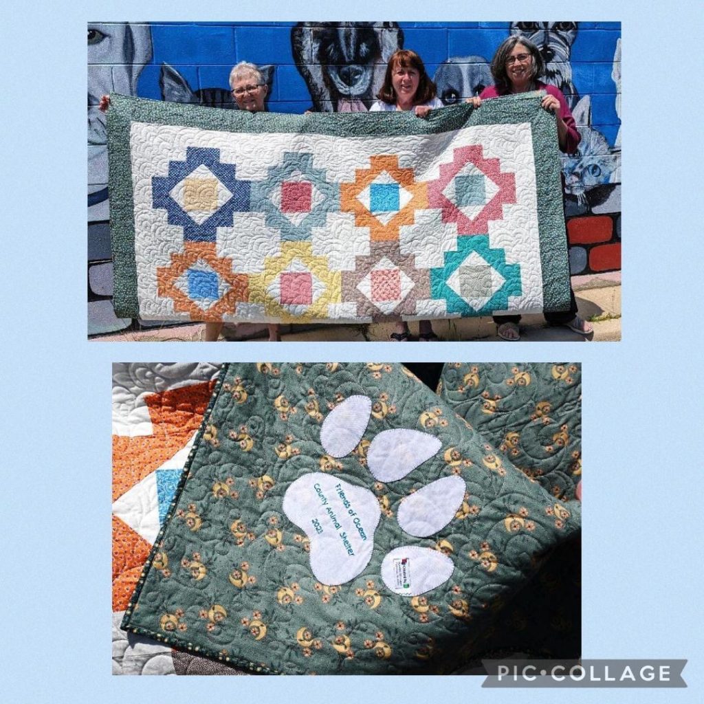 This hand crafted, amazingly beautiful quilt was made by the Seaport Stitchers Guild in Tuckerton, NJ, and donated to the Friends of Southern Ocean County Animal Shelter on Wednesday, August 2, 2023. Pictured from left to right – Gen Pagliaro, Charity Coordinator, Linda Cook, FOSOCAS President, Jill De Felice President Seaport Stitchers Guild. Thank you so much for this beautiful quilt!